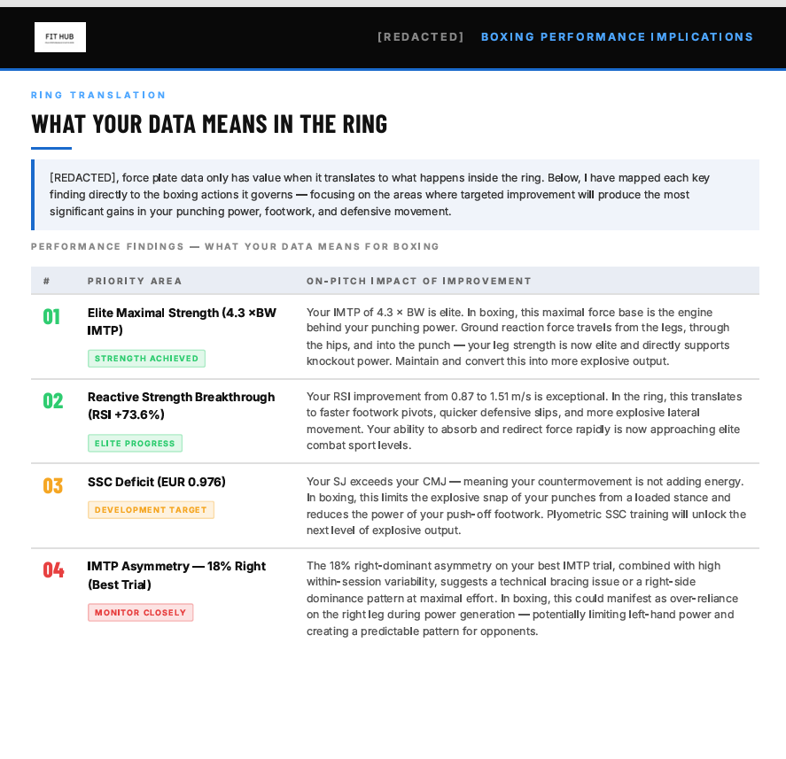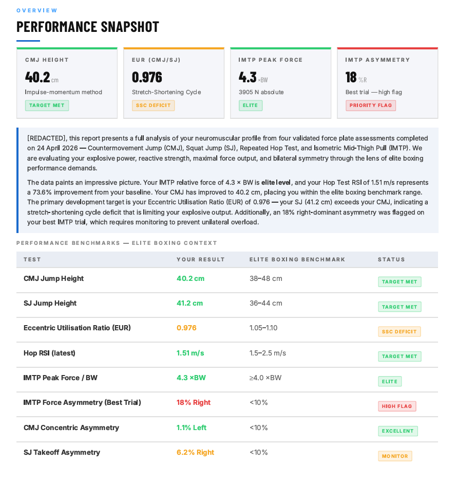 Actionable Recommendations: Our coaches will walk you through your report, explaining what the data means for you and providing clear, evidence-based recommendations to optimise your training, enhance performance, and reduce injury risk.